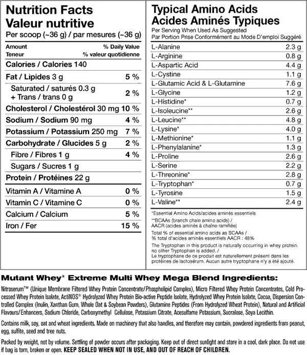 Η MUTANT WHEY είναι η πρωτεΐνη με τις περισσότερες πωλήσεις της μάρκας, και για καλό λόγο. Το μείγμα πρωτεϊνών περιέχει συμπυκνωμένη πρωτεΐνη ορού γάλακτος, απομονωμένη πρωτεΐνη ορού γάλακτος και υδρολυμένη πρωτεΐνη ορού γάλακτος. Κάθε μερίδα περιέχει 22 γραμμάρια πρωτεΐνης ορού γάλακτος, χωρίς πληρωτικά, παρέχοντας τα καλύτερα συστατικά για την υποστήριξη της μυϊκής ανάπτυξης.