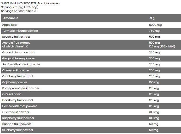 Το Super Immunity Booster της FA Nutrition είναι μια εξαιρετική σύνθεση φυτικών ινών, λαχανικών και φρούτων που ενισχύουν το ανοσοποιητικό σύστημα. Τα συστατικά αυτού του συμπληρώματος περιέχουν φυσικά συστατικά όπως βιταμίνη C και πολυφαινόλες, τα οποία επιδρούν θετικά στην υγεία του μεταβολισμού. Η φόρμουλα του προϊόντος είναι απαλλαγμένη από χρωστικές ουσίες, ζάχαρη και ζωικά πρόσθετα, καθιστώντας το φιλικό για vegans και χορτοφάγους. Το Super Immunity Booster προσφέρεται σε μορφή άγευστης και εύκολα διαλυτής σκόνης, που μπορεί να προστεθεί εύκολα σε άλλα ποτά ή φαγητά.