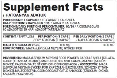 Το VITA - Maca περιέχει 1600 mg σκόνη ρίζας maca σε κάθε μερίδα (2 κάψουλες)